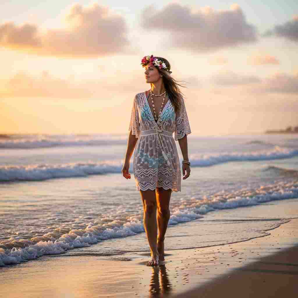 A crochet or gauze cover-up dress over swimwear creates ethereal beach style that photographs like a dream.