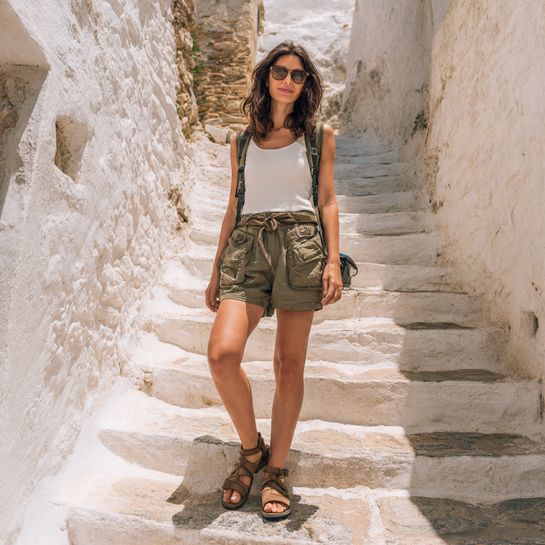 Olive cargo shorts with a fitted tank top create a functional yet stylish look ideal for active city sightseeing or beach activities.