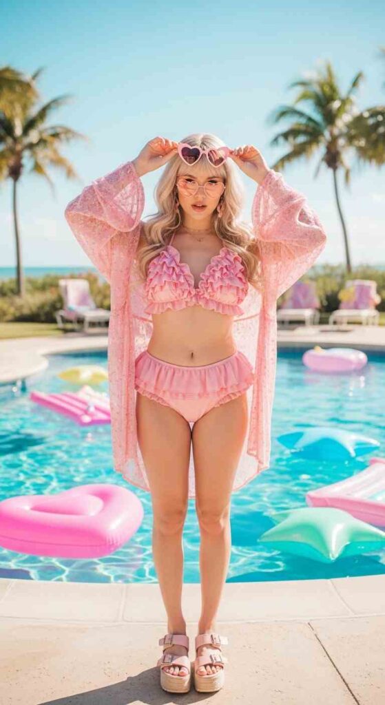 Ruffled bikini with pink accessories creates kawaii summer cuteness.