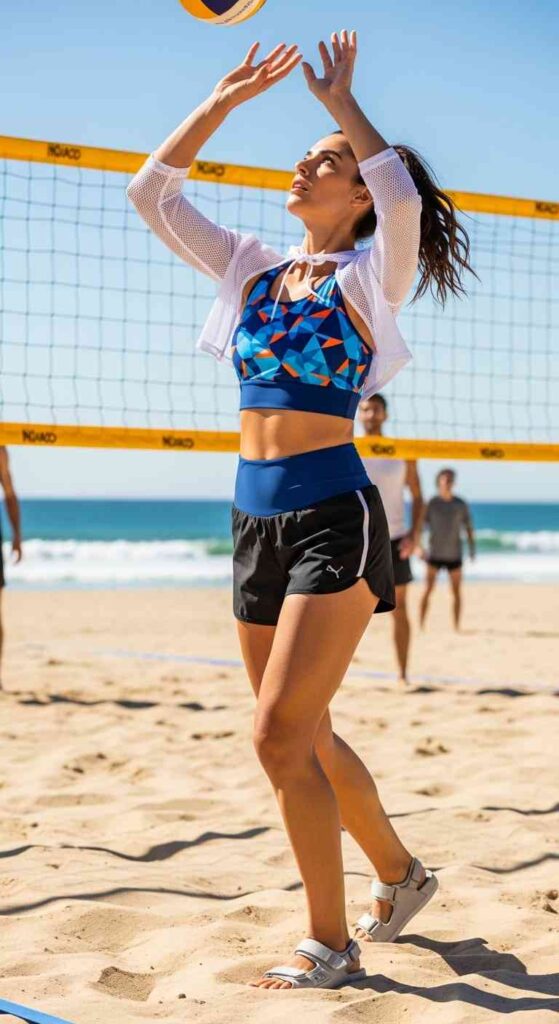 Shorts and pants coordination—denim cutoffs, linen pants, or athletic shorts create casual coverup options that allow active beach activities while completing outfit aesthetic.