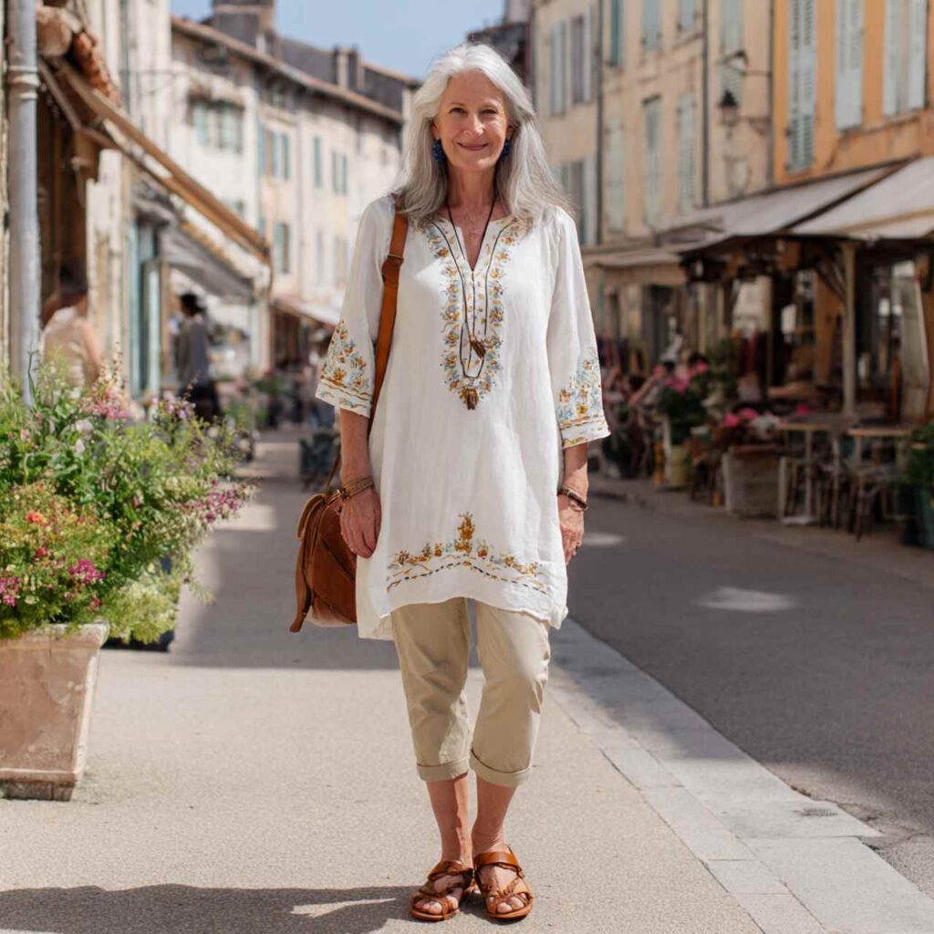 Choose a tunic in lightweight fabric with interesting detailsโ€”embroidery, pintucks, or prints. Pair with capri pants in coordinating colors. The tunic should hit at mid-thigh, providing coverage while remaining cool. Add comfortable sandals or walking shoes. This outfit works for sightseeing, travel, outdoor festivals, or casual activities requiring comfortable coverage. The tunic-over-pants approach works across body types while keeping you genuinely cool.
