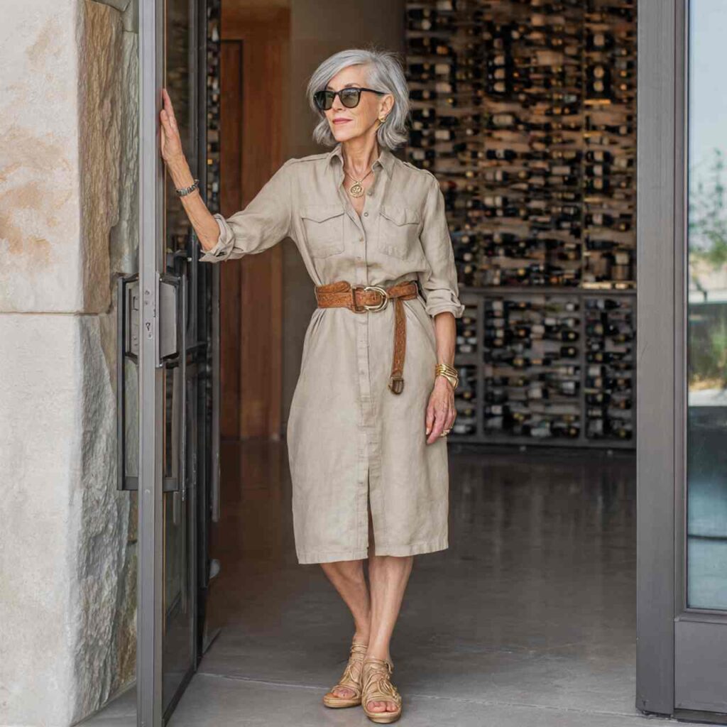 Select a shirtdress in quality linen or cotton with good drape. Look for styles with waist definitionโ€”either belted or naturally fitted. The length should hit below the knee for elegant coverage. Add wedge sandals or flats and simple accessories. This versatile dress works for everything from casual to dressy depending on styling. The button-front provides adjustable ventilation while the collar adds structure. Choose solid colors for versatility or subtle prints for interest.
