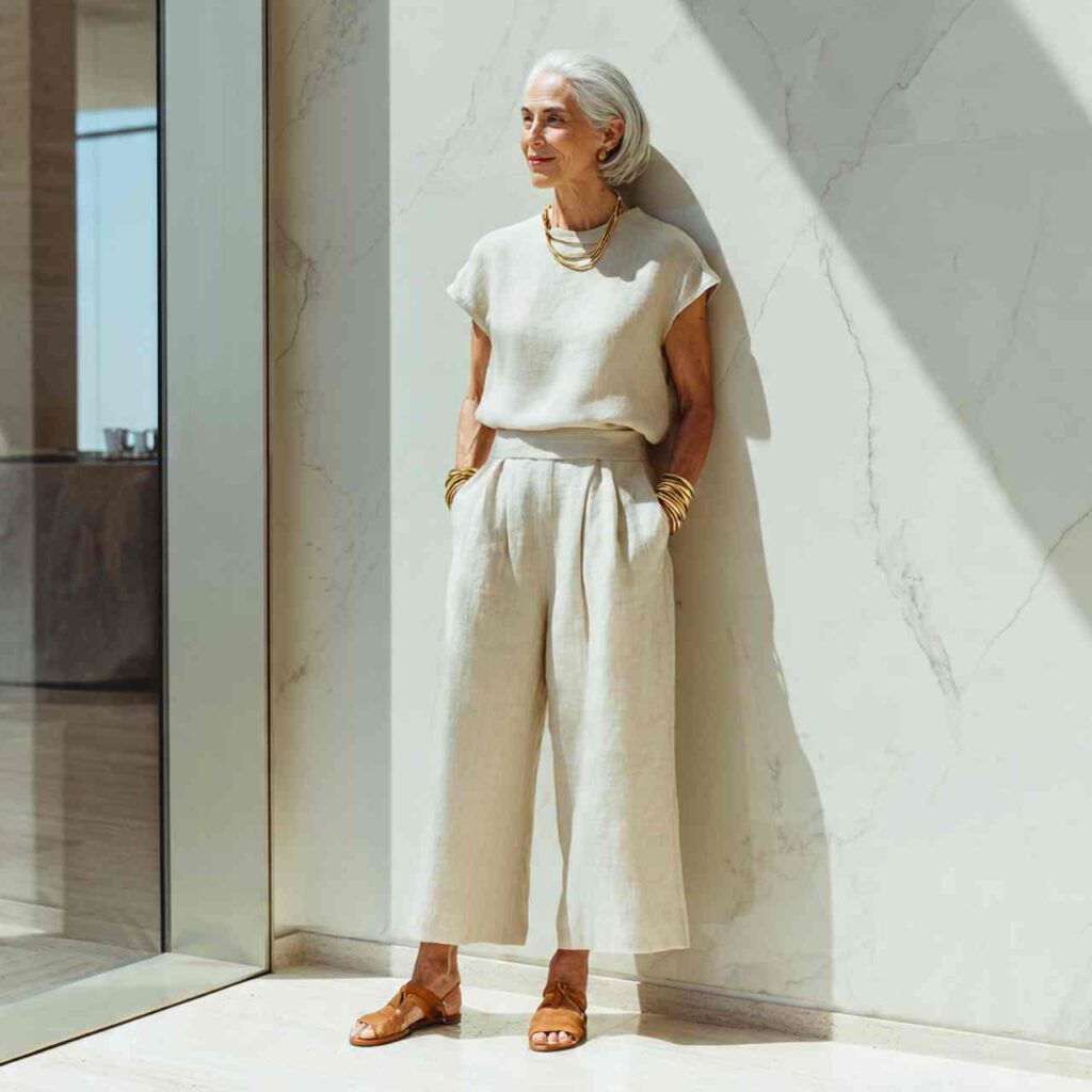 Choose a matching linen setโ€”typically wide-leg pants and a coordinating top, or skirt and blouseโ€”in neutral summer colors. The matching aspect creates cohesion and polish without requiring thought. Add simple accessories and comfortable sandals. These sets work for travel, casual events, shopping, or everyday summer activities. The breathable linen keeps you cool while the coordinated look ensures you appear put-together with minimal effort.