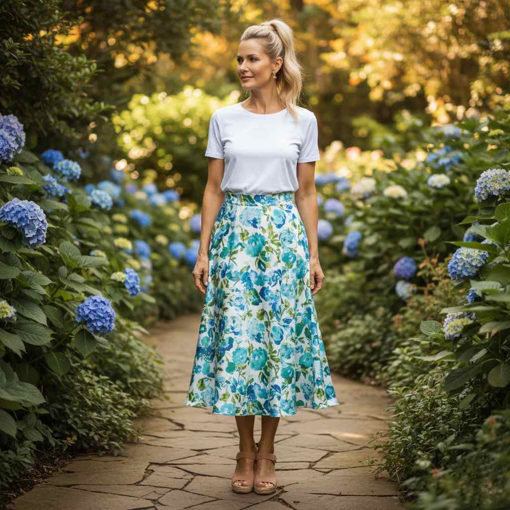 A printed midi skirt becomes the outfit’s focal point when paired with simple solid tops. This combination offers interest without overwhelming.