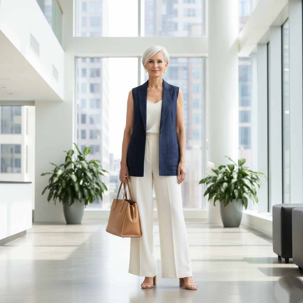 A sleeveless blazer offers structure without sleeves’ heat. Paired with wide-leg pants, this creates sophisticated summer professional style.