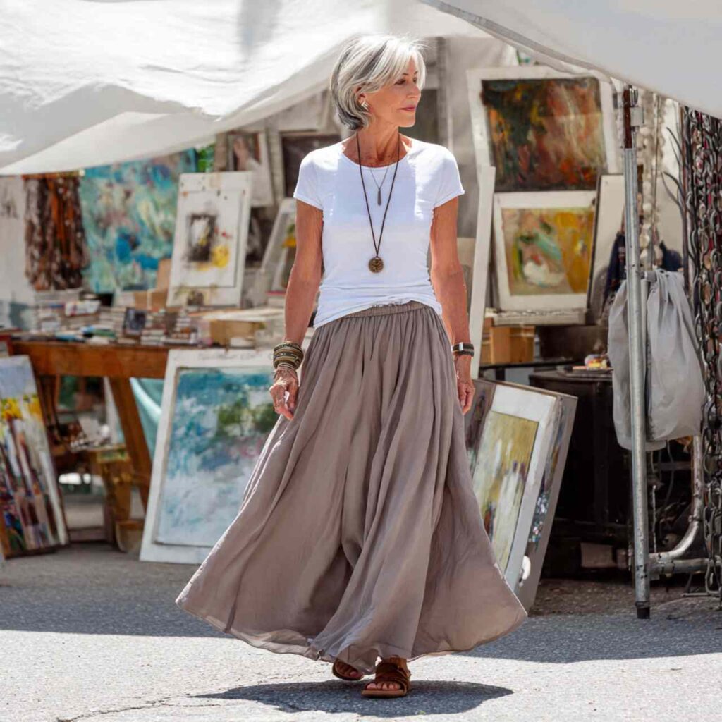 A flowing maxi skirt paired with a quality basic tee creates comfortable elegance. This combination offers coverage and ease while maintaining style.