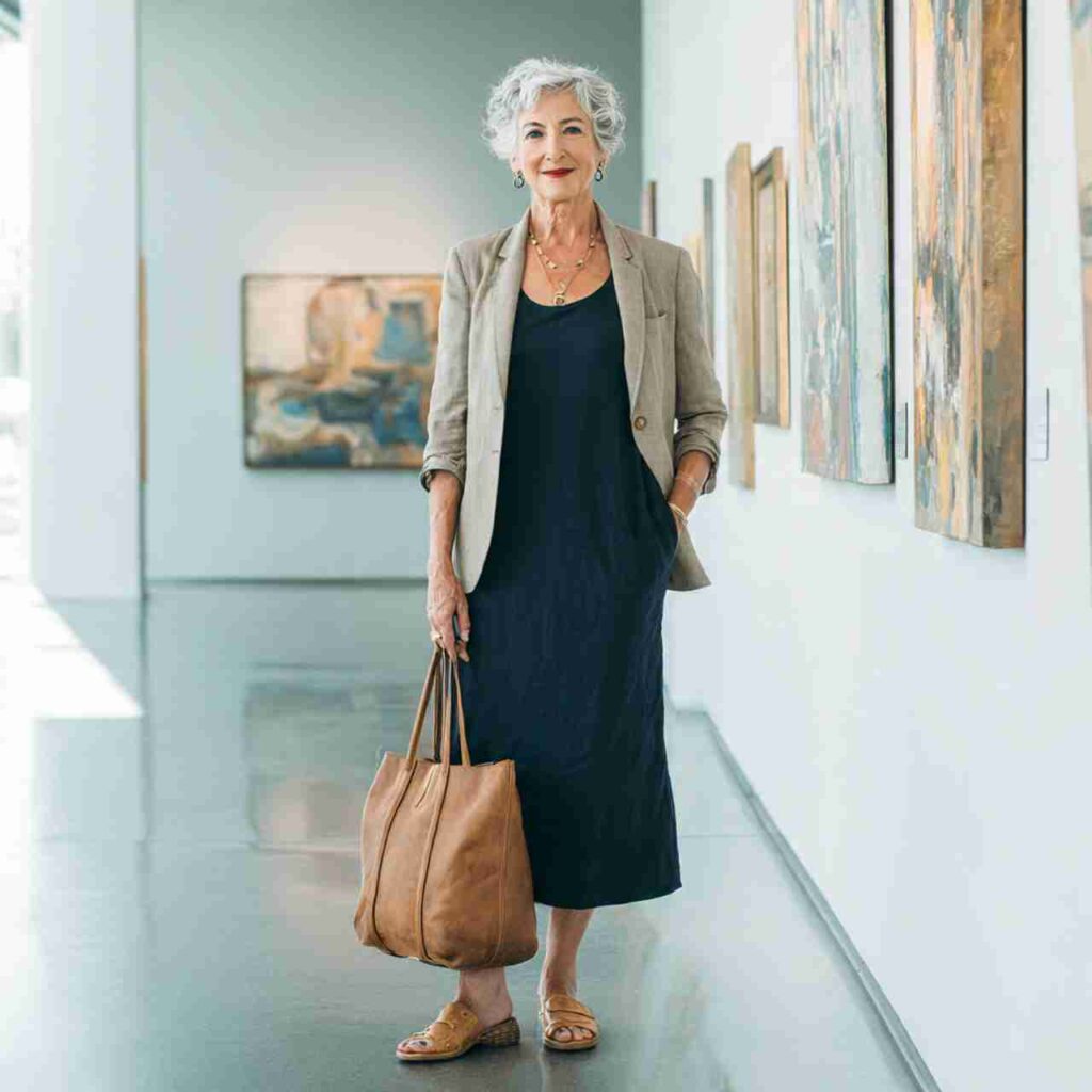 Wear a simple sleeveless tank dress in solid colors as your base. Layer an unstructured linen blazer in neutral or complementary tones. The blazer adds sophistication and sun protection while remaining lightweight. Add wedge espadrilles or loafers and a structured handbag. This combination works beautifully for business casual summer settings, client lunches, gallery openings, or anytime casual needs slight elevation. The blazer can be removed when temperatures peak, making this adaptable throughout the day.
