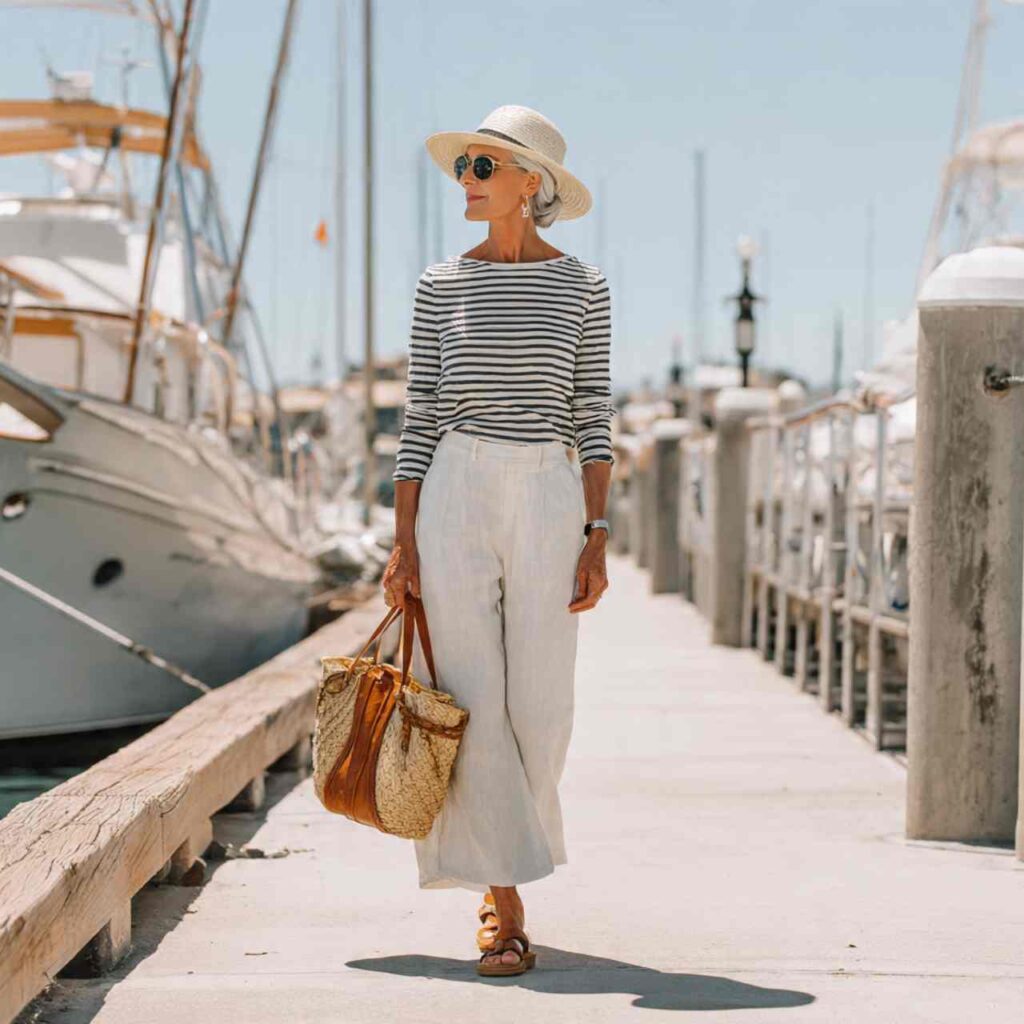 Choose wide-leg linen pants in neutral colorsโ€”white, beige, or soft grey. Pair with a striped boatneck topโ€”navy and white is classic but consider other color combinations. The wide legs provide air circulation while creating elegant proportions. Add flat sandals or espadrilles and minimal jewelry. This outfit works for travel, waterfront activities, casual lunches, or relaxed summer days. The flowing pants feel luxurious while the stripes add visual interest without being overwhelming.