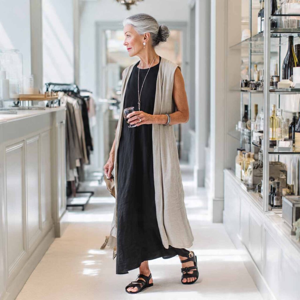 Wear a simple sleeveless or short-sleeve dress as your base. Layer a long linen cardiganโ€”hitting mid-thigh or longerโ€”in neutral tones. The cardigan provides coverage and sophistication while remaining breathable. Add flat sandals or low heels depending on the occasion. This combination works for restaurant dining, shopping, theater, or travel days. The long cardigan creates vertical lines that elongate while the open front prevents overheating.