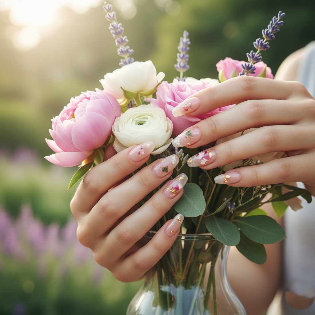 Transparent or nude gel with real dried flowers encapsulated within. Tiny pressed flowers, petals, and leaves are artfully placed on accent nails, creating a romantic garden-inspired look.