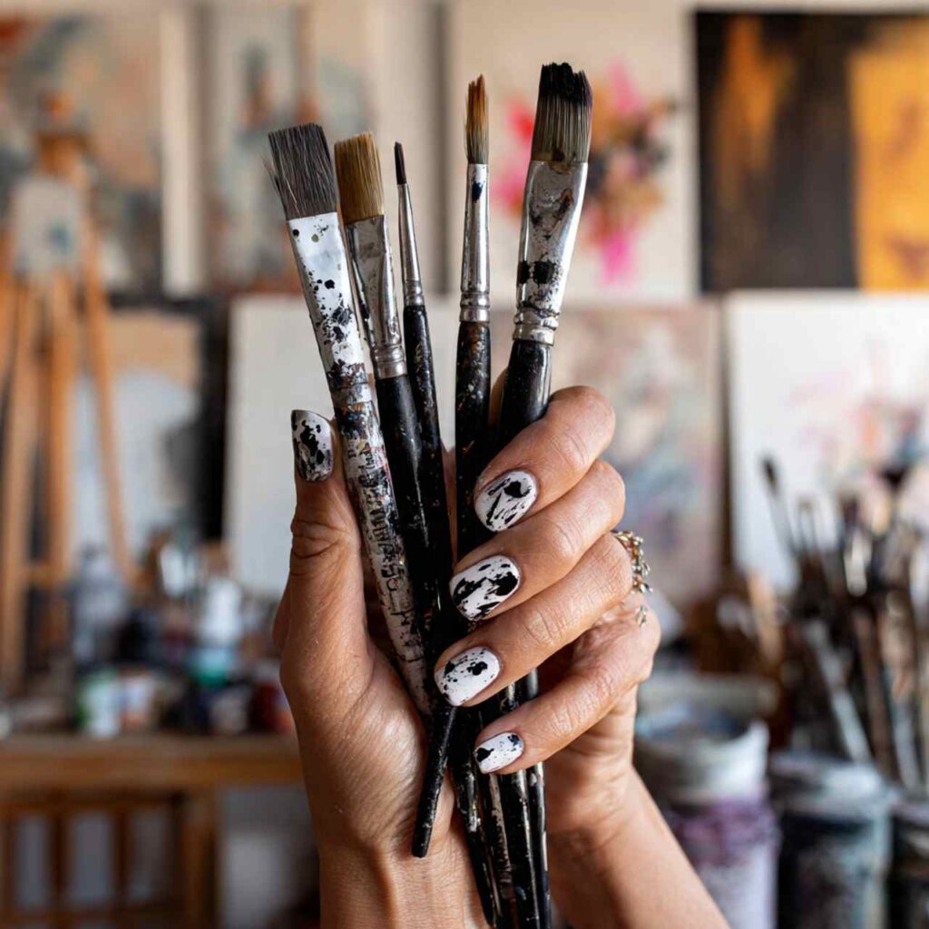 White or cream base with bold black abstract brushstrokes creating artistic designs. Each nail features different brush marks, making every finger a unique piece of wearable art.