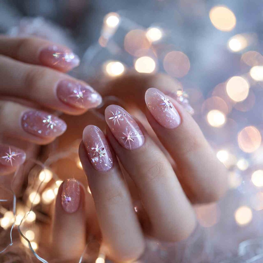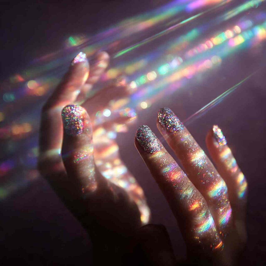 Clear or pale pink base loaded with holographic glitter that creates rainbow sparkle. The fine fairy-dust-like particles catch light from every angle, making nails appear magical and dimensional.