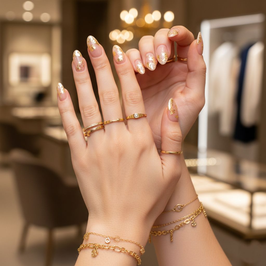 Clear or nude base with genuine gold leaf flakes artfully placed. The metallic foil pieces create an expensive, artistic look that’s perfect for special occasions and luxury moments.