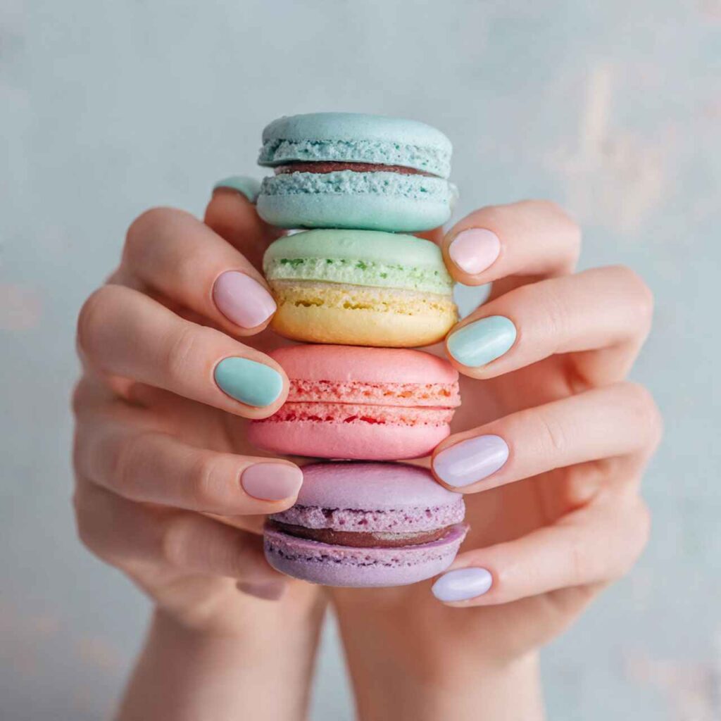Each nail in a different soft pastelโ€”lavender, mint, peach, baby blue, and butter yellow. The ballerina shape makes this playful rainbow effect feel sophisticated rather than juvenile.