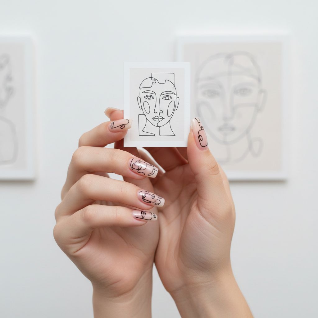 Nude or white base with simple black line drawingsโ€”faces, abstract shapes, or delicate florals. The clean canvas of ballerina nails showcases these minimalist artistic designs beautifully.