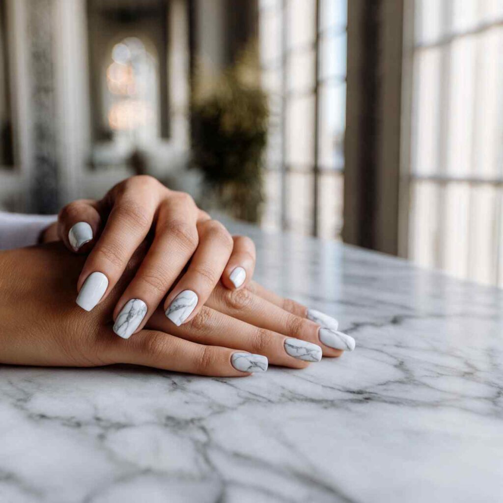 Most nails in solid white or nude with one or two accent nails featuring realistic gray marble patterns. The veining and stone-like texture on the ballerina shape creates expensive-looking art that’s surprisingly wearable.