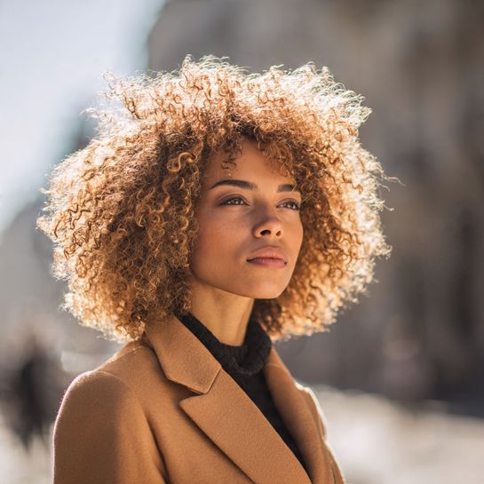 Rich toffee-blonde shades create surprising harmony with dark skin, offering a unique take on blonde that’s warm and wearable.