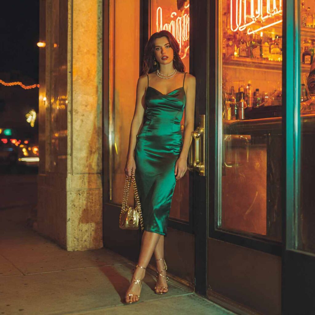 A midi-length satin slip dress in emerald green with delicate straps creates effortless elegance. Pair with strappy heeled sandals and a mini shoulder bag. Add layered gold necklaces and let your hair fall in loose waves. The satin catches light beautifully under bar lighting.