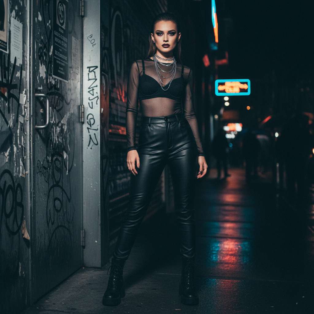 A sheer mesh long-sleeve top worn over a black bralette, paired with high-waisted leather pants or a mini skirt creates layered intrigue. The mesh adds edge while maintaining coverage.