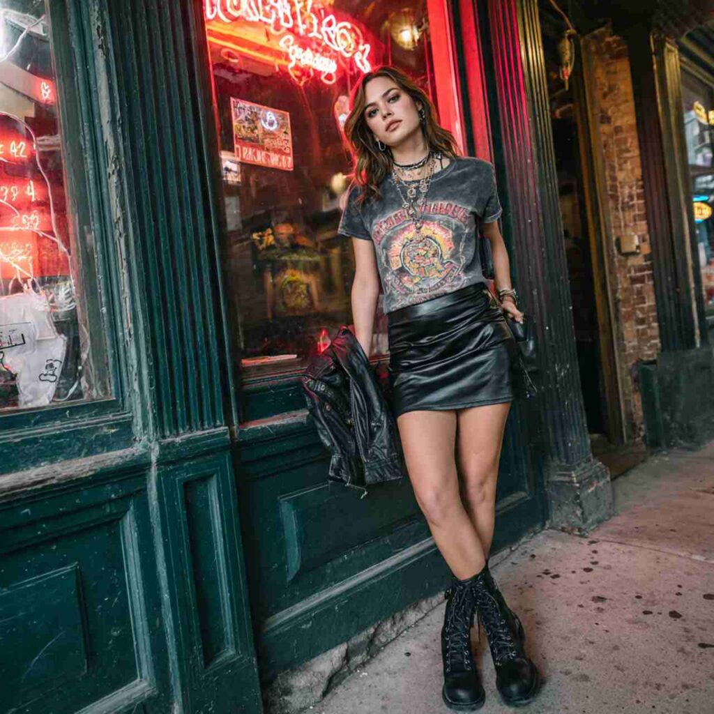 A vintage band tee or graphic tee tucked into a leather or satin mini skirt creates casual-cool contrast. Add combat boots or heels depending on the venue vibe, and layer on the accessories.