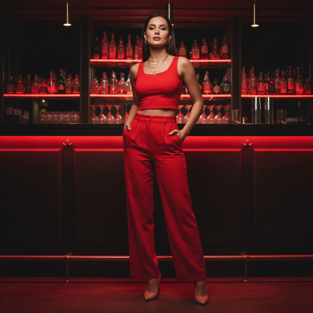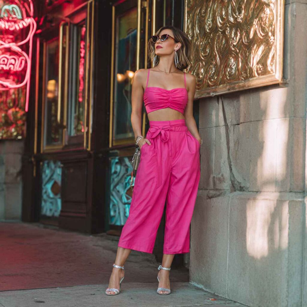 A matching two-piece setโcropped tank and high-waisted pantsโin a bold color like hot pink or electric blue makes a statement. Add metallic heels and minimal jewelry to let the color pop.