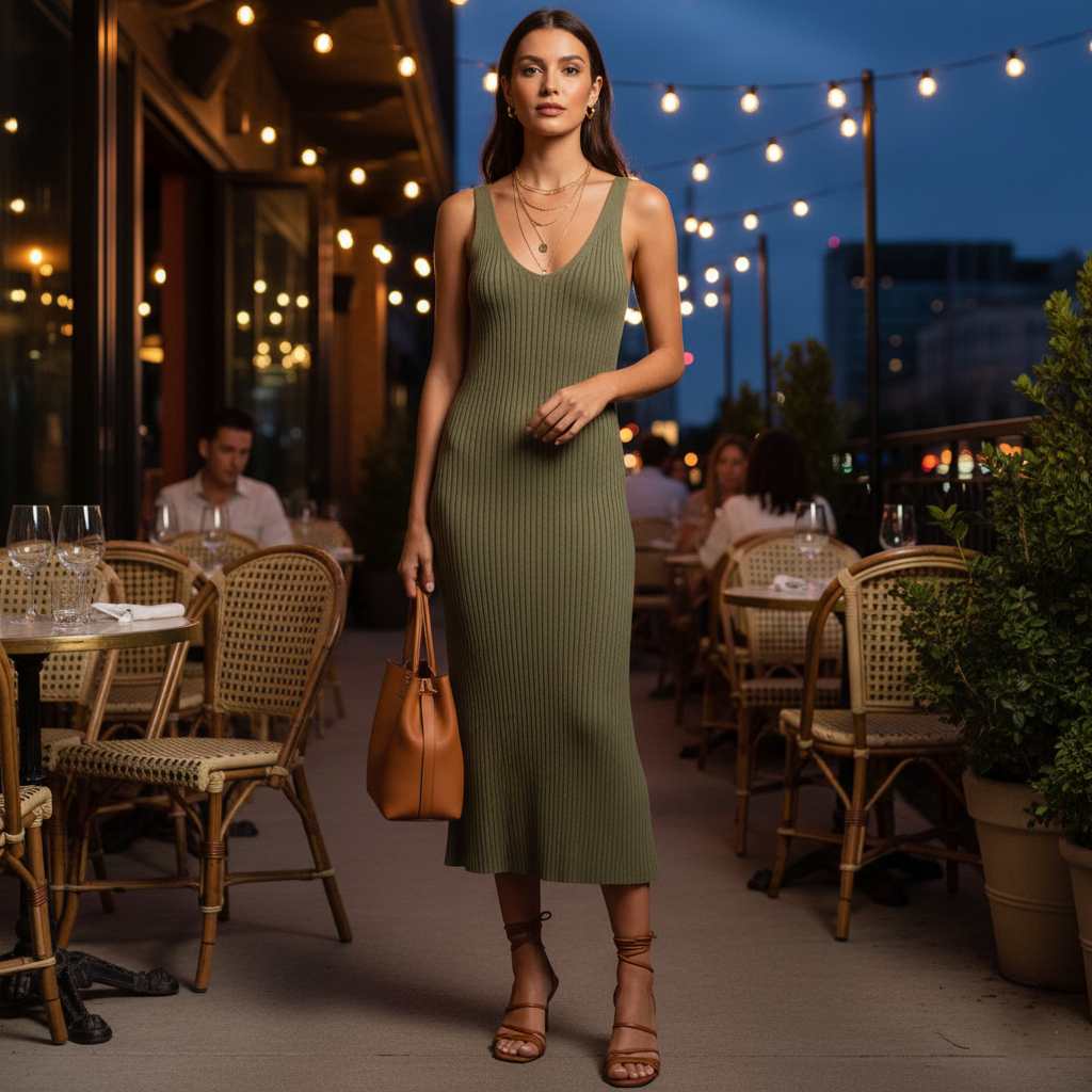 A simple ribbed tank dress in a neutral or earth tone, elevated with the right accessoriesโlayered necklaces, a structured bag, heeled sandals, and a great lip color. Sometimes simplicity is the most chic.