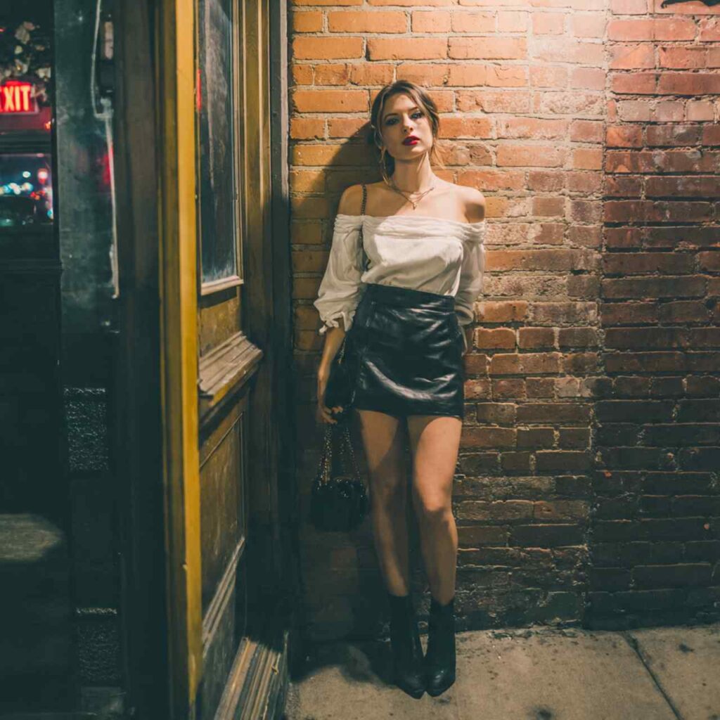 A black leather or faux-leather mini skirt paired with an off-shoulder white top creates classic contrast. Add ankle boots or strappy heels, a small shoulder bag, and bold red lipstick for extra impact.