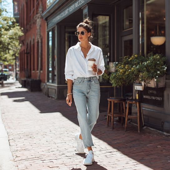 A perfectly worn-in pair of straight-leg jeans paired with an oversized white button-down shirt half-tucked and rolled sleeves, finished with white sneakers creates effortless weekend elegance.