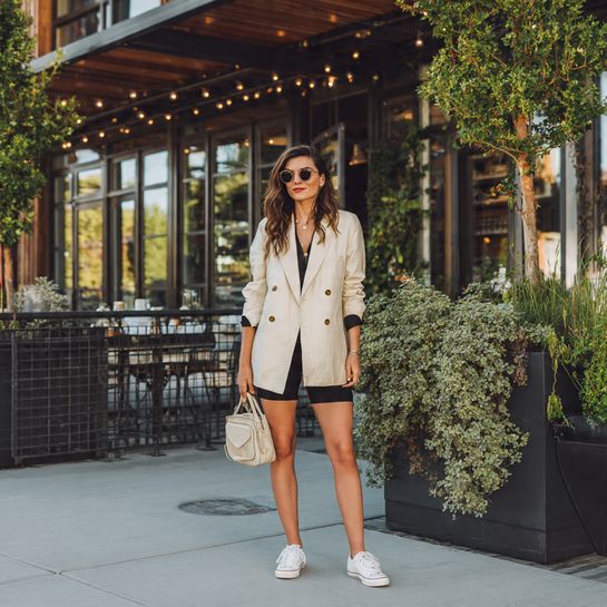 Black bike shorts paired with an oversized boyfriend blazer and sneakers creates contemporary athleisure-meets-tailored Saturday style.