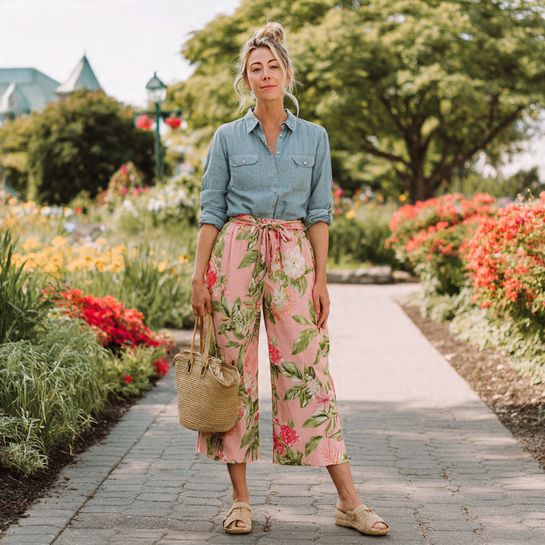 Why it works: The neutral chambray grounds any printed pant while the pattern adds personality and prevents the outfit from feeling too basic.