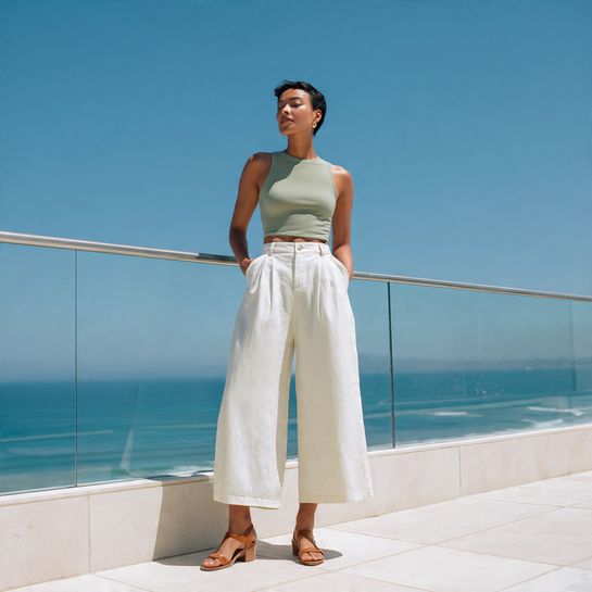High-waisted linen pants in white or cream paired with a simple crop top and sandals creates breezy Saturday ease.