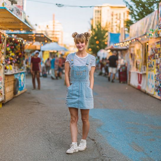 A denim overall dress layered over a striped or solid tee with sneakers creates playful Saturday nostalgia.