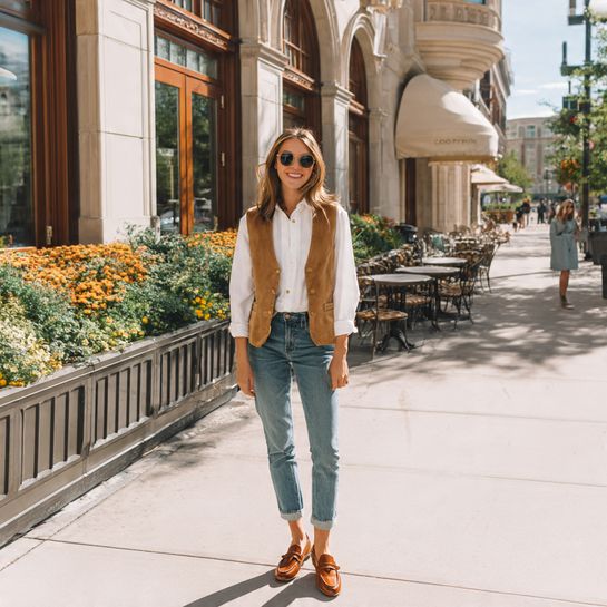Why it works: Vests are trending in 2026 and add structure without the commitment of a full blazer. This layered look shows styling effort while remaining comfortable.