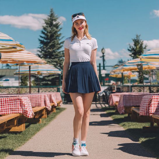 A fitted polo shirt tucked into a pleated tennis-style skirt with sneakers creates sporty-chic Saturday energy.