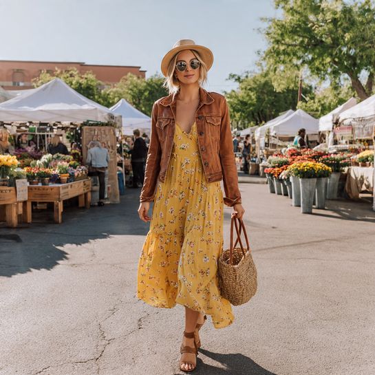 A breezy floral or solid midi dress paired with a cropped denim jacket and comfortable sandals creates feminine Saturday ease perfect for brunch or market browsing.