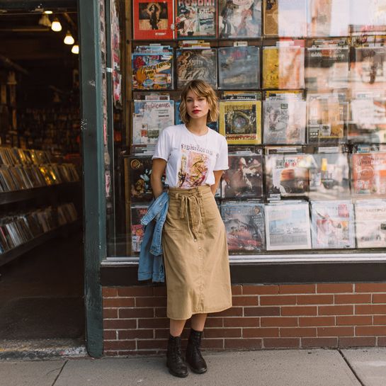 A denim or cotton button-front skirt paired with a tucked-in graphic tee and ankle boots creates personality-filled Saturday style.