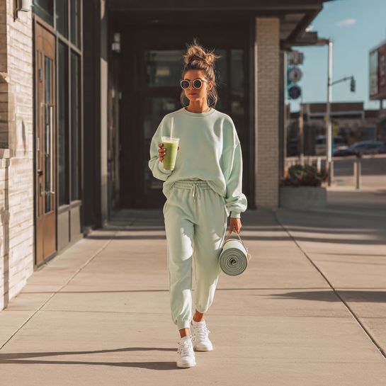 Why it works: Matching sets look intentional and expensive while providing maximum comfort. The spring color elevates it beyond basic grey sweats.