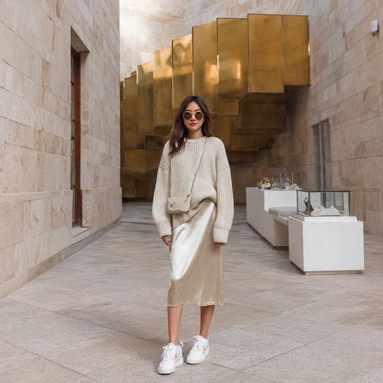 Why it works: The contrast between sporty sneakers and elegant slip skirt creates modern styling that feels fresh. The sweater bridges the two pieces perfectly.