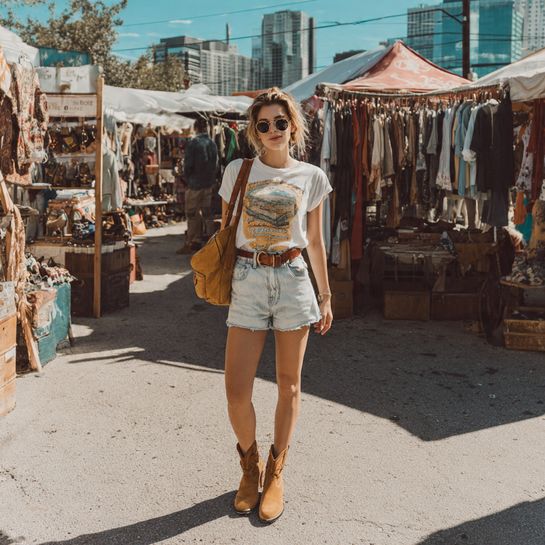 A vintage-style graphic tee tucked into high-waisted denim shorts with a belt and ankle boots creates playful weekend personality.