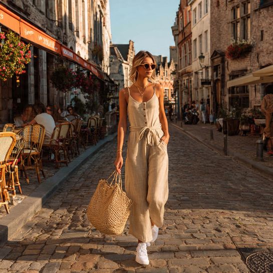 Why it works: Jumpsuits eliminate decision-making while looking polished. Linen breathes beautifully for warmer Saturdays and the sneakers keep it grounded and comfortable for walking.