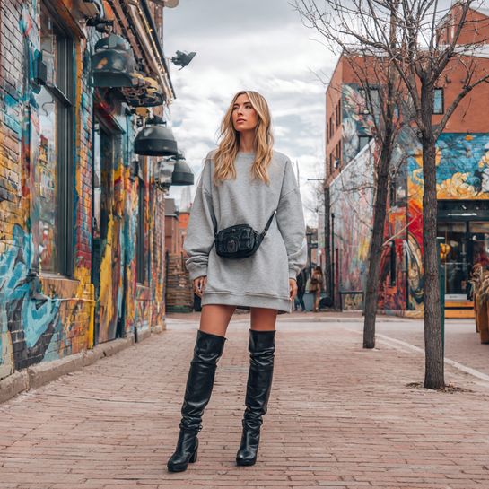 An oversized sweatshirt dress in a soft color paired with knee-high boots creates cozy-meets-polished Saturday style.