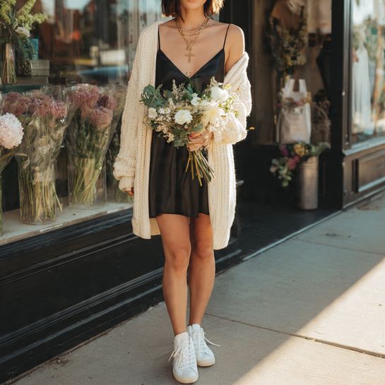 Why it works: The slip dress adds femininity while the cardigan provides warmth and casual ease. Sneakers ground the dressy slip dress making it wearable for daytime activities.