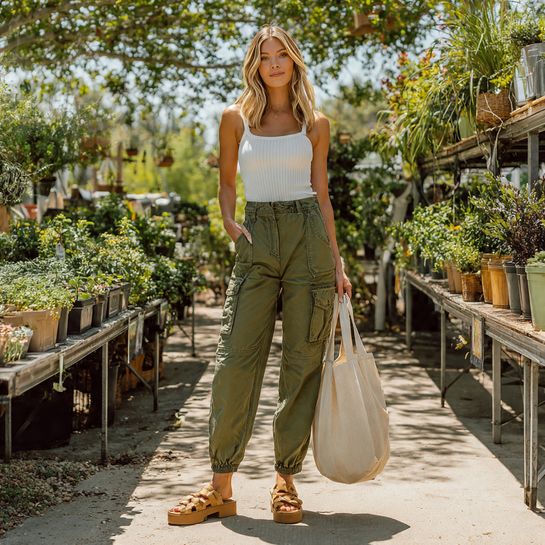 Relaxed cargo pants in olive or tan paired with a ribbed fitted tank and chunky sandals creates utilitarian Saturday cool.