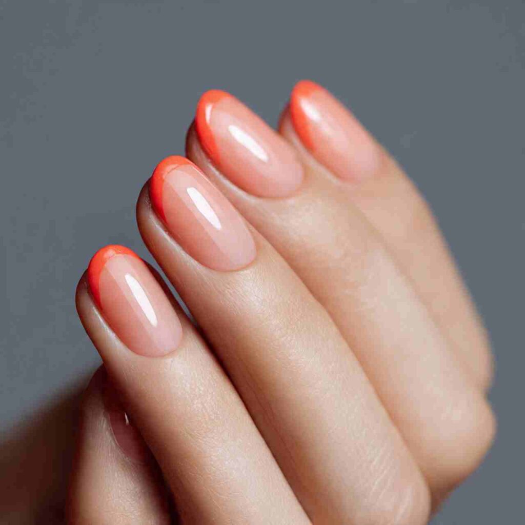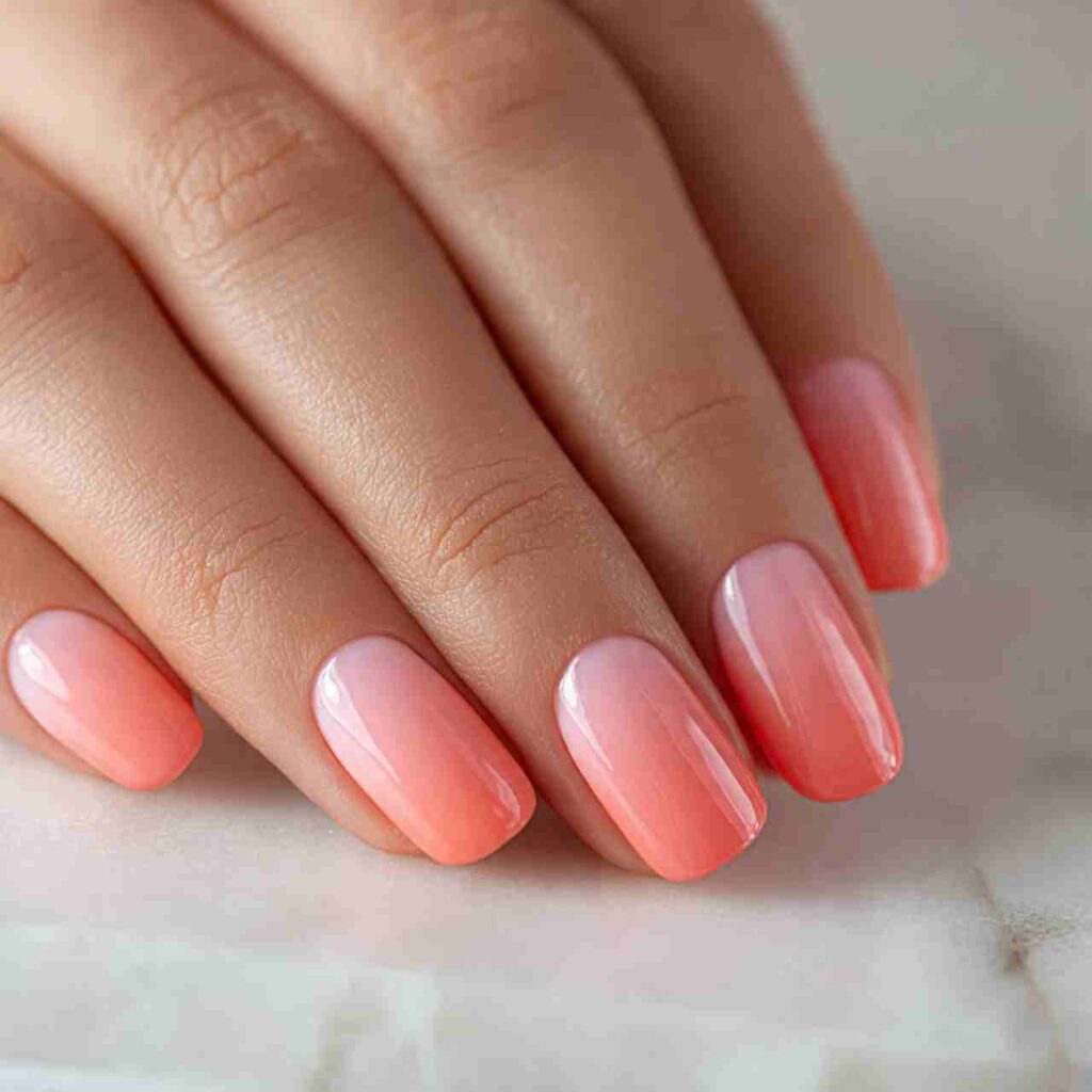 This design captures the dreamy hues of a summer sunset with a glossy, glazed finish. The gradient flows from warm coral at the cuticle to soft peachy pink at the tips, creating a seamless transition that elongates short nails visually.