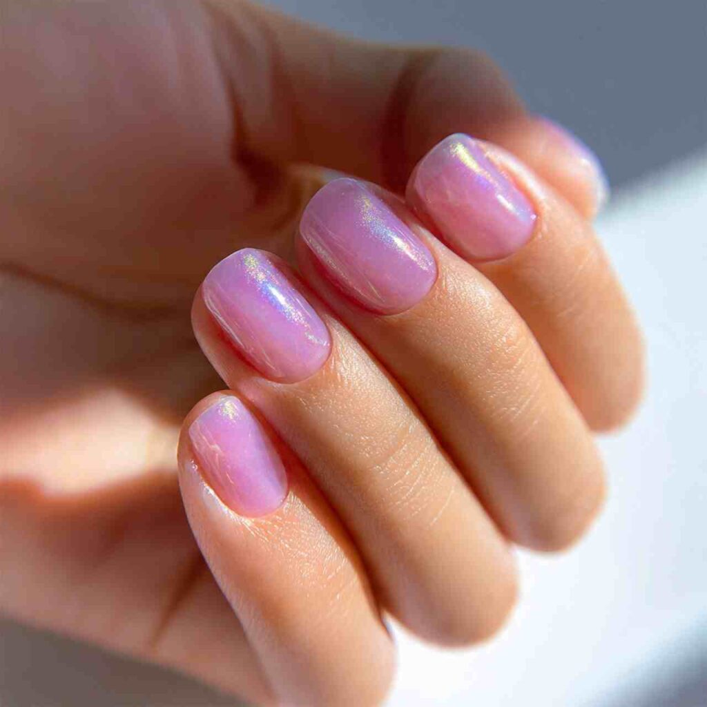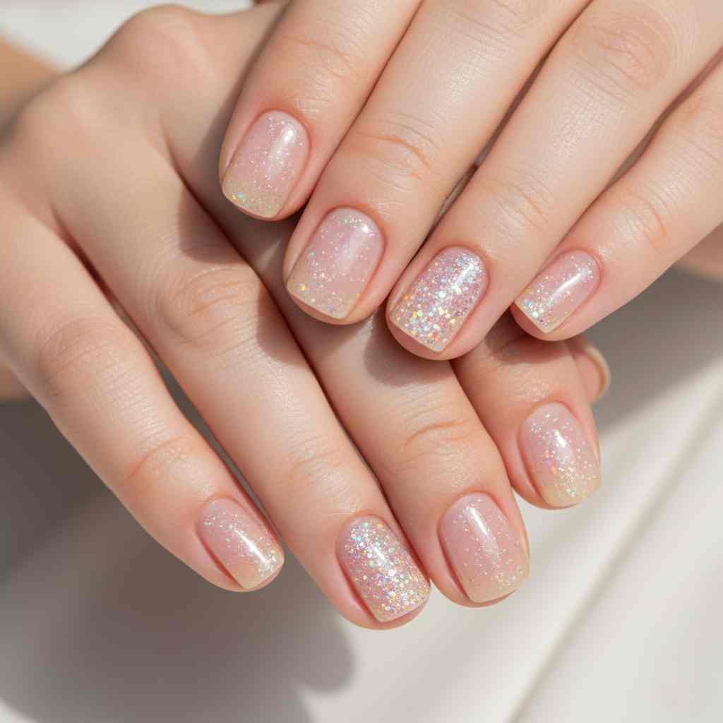 A whisper of fine iridescent glitter suspended in a clear or nude base gives nails a subtle sparkle that catches the light beautifully.