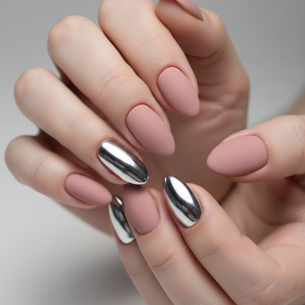 Four nails in soft matte nude, one nail per hand in full chrome finish. The contrast between textures creates maximum impact with minimal effort.