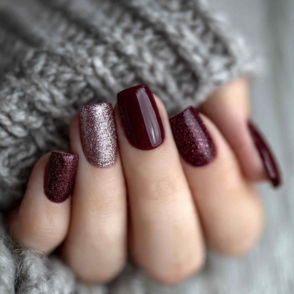 All nails in the same color family but different finishes: glossy, matte, metallic, and shimmer. The tonal variation creates depth.