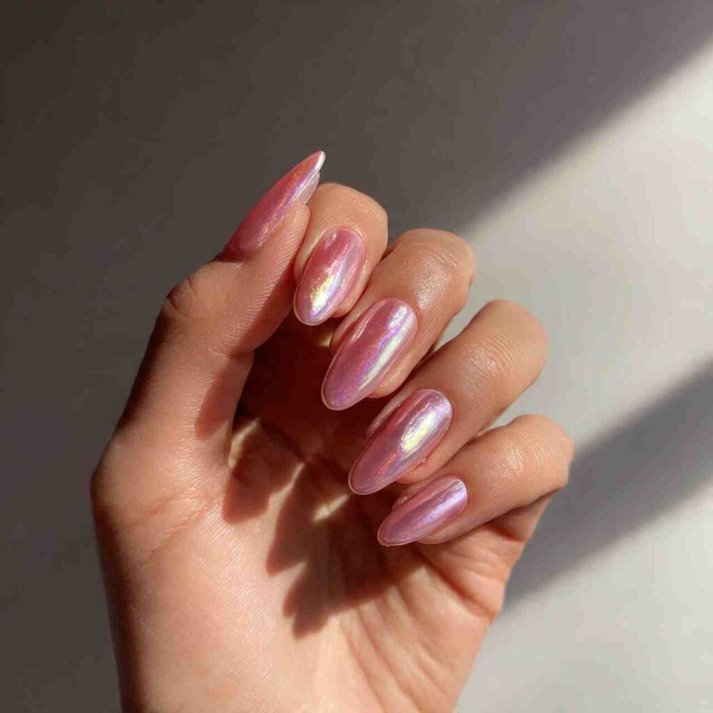 Inspired by the viral glazed donut trend but refined for 2026. An iridescent pearl chrome that shifts in the light, applied over a sheer pink base.