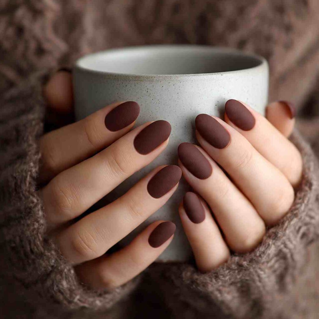 Rich, deep mocha brown in a luxurious matte finish that looks like expensive suede. This monochromatic look is elevated by the texture alone.