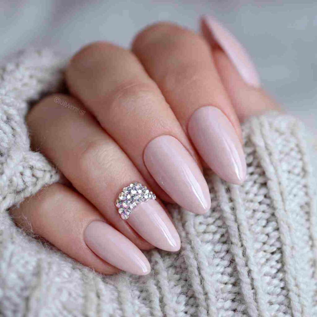 One nail per hand features a single, high-quality crystal or pearl placed at the base of the nail. The rest remain in a complementary solid color.